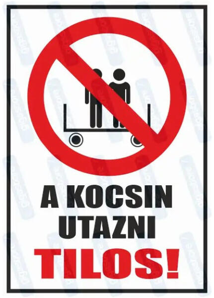 Kocsin utazni tilos " felirat, és tiltó piktogram, öntapadós vinyl matrica, vagy PVC tábla. -UV és időjárás álló-Több méretben választhatóA tiltó fehér alapon áthúzott piros kör és fekete piktogram jelzések a biztonságot és az egészséget veszélyeztető magatartást tiltanak, valamint figyelmeztetnek a veszélyforrásra.