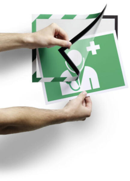 DURAFRAME® SECURITY, két szín kombinációval ellátott öntapadó keret mágneses záródással. A biztonsági figyelmeztetések és előírások gyorsan és egyszerűen cserélhetők, mindkét oldalról olvashatók, amennyiben kihelyezésük üveg felületen történik. A4-es méretben, mely használható álló és fekvő formátumban egyaránt. Minden sima felületen használható. Üvegre helyezve a keret mindkét oldalon látszik. Információ kihelyezés tökéletesen A kihelyezett információk könnyedén cserélhetők a mágneses záródásnak köszönhetően Könnyen kihelyezhető bármilyen sima felületen Felhasználási területek: biztonsági előírások és figyelmeztetések kihelyezése, pl: zöld / fehér: elsősegélynyújtás, menekülési útvonalterv, piros/fehér: tűzbiztonság, veszély, tiltás, sárga/fekete: biztonság, figyelmeztetések A színek megfelelenek az ISO 3864-4 előírásainak Üvegen használva a keret, és színei mindkét oldalon megjelennek Álló és fekvő formátumban is használható Külső méret: 174 x 236 mm Katalóguskód: 24808