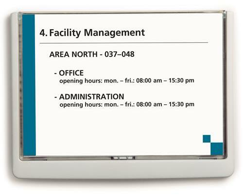 Innovatív információs tábla, vonzó lekerekített szélekkel. Ötvözi a modern designt és a funkcionalitást. -felhasználási terület: oktatási központokban, kórházakban, vendéglátásban stb. -a betétlapok könnyen cserélhetők -rögzítés: csavaros -anyag: műanyag -tájolás: álló -formátum: A5 -külső méretek: 233 x 177 mm (szé x ma) -címke méretek: 210 x 148,5 mm (szé x ma) -szerelőkészlettel, fúrósablonnal és útmutatóval együtt -nyomtatható betétlapok külön kaphatók    Itt megtekinthető és letölthető a termékadatlap.   Itt megtekinthető és letölthető a környezetvédelmi adatlap. Gyártó/első EU forgalmazó elérhetősége: DURABLE Hunke & Jochheim GmbH & Co. KG Westfalenstrasse 77-79, D- 58636 Iserlohn, Germany info@durable. de www. durable. deAlcsoporttáblaRögzítés módjacsavarosAnyagműanyag