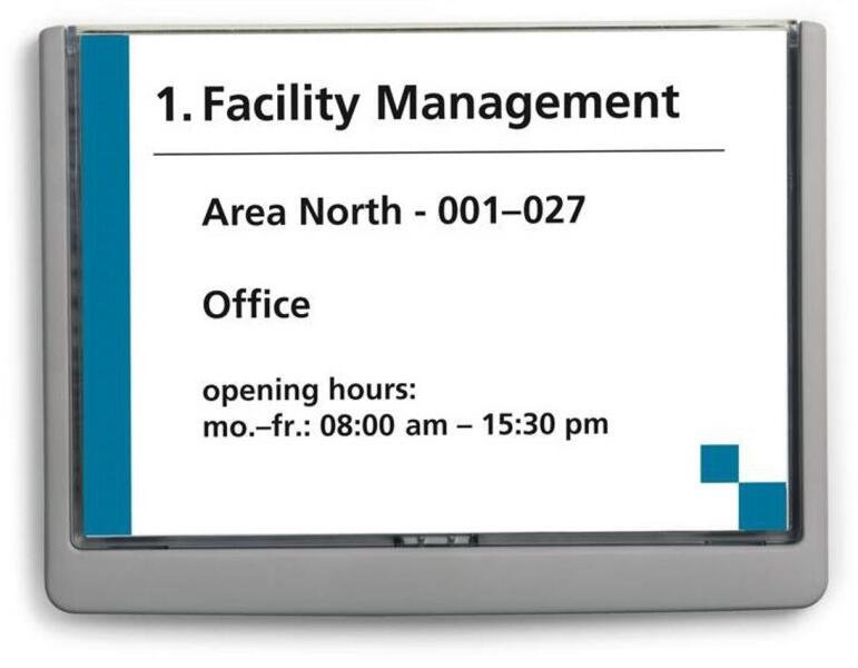 Irányítótábla, stílusosan megtervezett, lekerekített sarkokkal, így a modern design funkcióval párosul. Az insertek könnyedén cserélhetők az átlátszó panel kihúzásával. Ideális megoldás olyan helyeken, ahol az információkat gyakran kell cserélni, mint például hotelekben, konferencia termekben, kórházakban. Nyomtatható insertek külön kaphatók. Katalóguskód: 51744