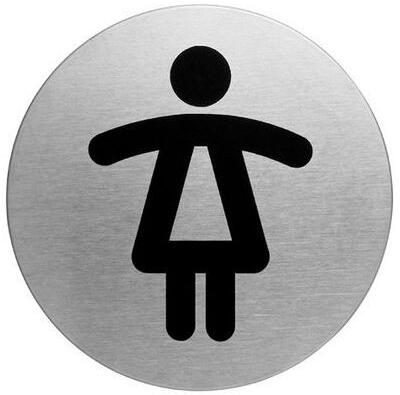 Női toalett, öltöző, zuhanyzó stb. jelölését szolgáló piktogram. Csiszolt acélból készült karcálló nyomattal. Rögzítés kétoldalas matricákkal.