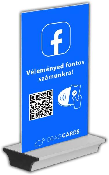 Előre gyártott, dragcards és facebook logóval rendelkező tábla, NFC chippel. Saját webes felülettel a linked módosításához. Részletes statisztika a látogatóidról.