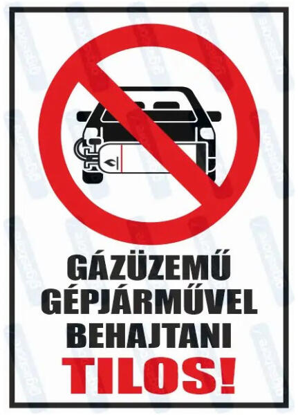 Gázüzemű gépjárművel behajtani tilos " felirat, és tiltó piktogram, öntapadós vinyl matrica, vagy PVC tábla. -UV és időjárás álló-Több méretben választhatóA tiltó fehér alapon áthúzott piros kör és fekete piktogram jelzések a biztonságot és az egészséget veszélyeztető magatartást tiltanak, valamint figyelmeztetnek a veszélyforrásra.