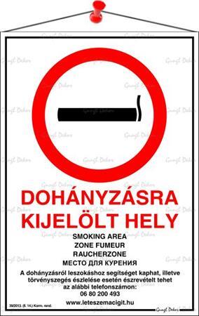 Dohányzásra kijelölt hely információs tábla - többnyelvű - anyaga: hullámos műanyaglemez, damil akasztóval - mérete: 21x31cm
