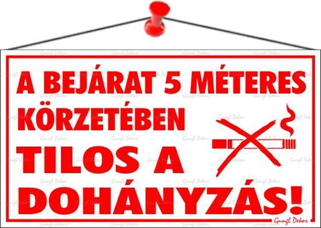A bejárat 5 méteres körzetében tilos a dohányzás! információs tábla - fehér alapon piros szöveg - anyaga: hullámos műanyaglemez, damil akasztóval - mérete: 22,5x12,5 cm