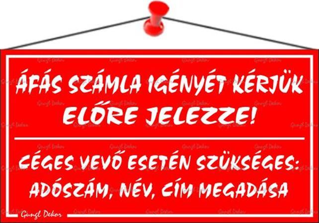 ÁFÁS számla igényét kérjük előre jelezze! információs tábla - piros alapon fehér szöveg - anyaga: hullámos műanyaglemez, damil akasztóval - mérete: 22,5x12,5 cm