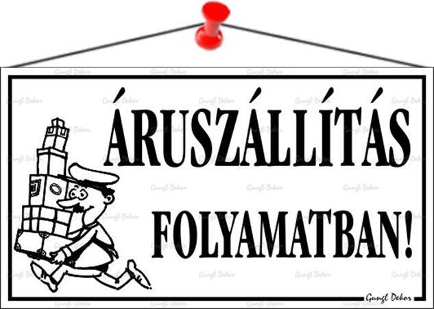 Áruszállítás folyamatban! információs tábla - fehér alapon piros szöveg - anyaga: hullámos műanyaglemez, damil akasztóval - mérete: 22,5x12,5 cm