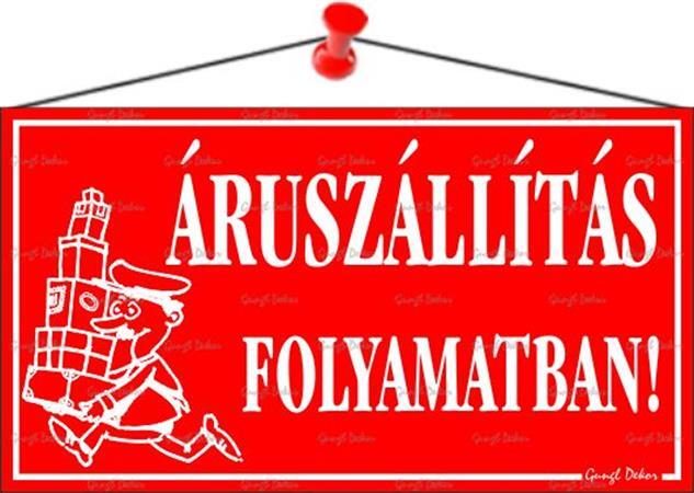 Áruszállítás folyamatban! információs tábla - piros alapon fehér szöveg - anyaga: hullámos műanyaglemez, damil akasztóval - mérete: 22,5x12,5 cm