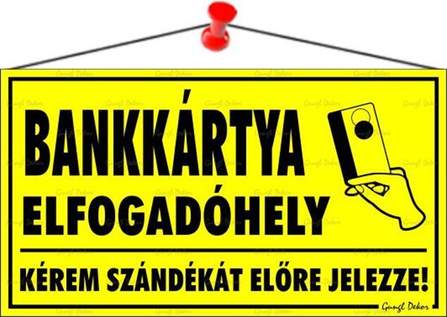 Bankkártya elfogadóhely információs tábla - sárga alapon fekete szöveg - anyaga: hullámos műanyaglemez, damil akasztóval - mérete: 22,5x12,5 cm