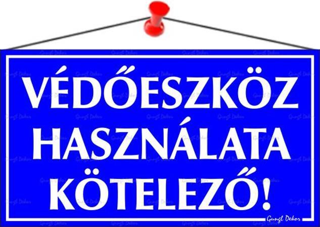 Védőeszköz használata kötelező! információs tábla - kék alapon fehér szöveg - anyaga: hullámos műanyaglemez, damil akasztóval - mérete: 22,5x12,5 cm