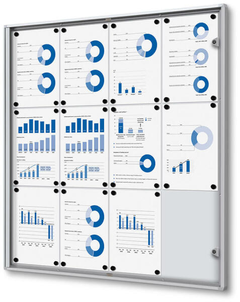 Belső információs kirakat Economy 12 x A4 - fémlemez hátlapFőbb jellemzőkMéret: 93,1 cm hosszúság, 96,3 cm magasság, 2,6 cm mélységKeret anyaga: alumíniumFelület: mágneses és írhatóAjtótípus: szárnyas ajtó plexiüveggelZár: hengeres zárMegfelelő formátum: 12 x A4Rendeltetés: belső használatraGarancia: 5 évA Belső információs kirakat Economy 12 x A4 kiváló megoldást nyújt irodák, intézmények vagy közösségi terek számára, ahol fontos az információk rendszerezett és átlátható bemutatása. A 12 darab A4-es méretű lap elhelyezésére alkalmas felület lehetővé teszi a különböző értesítések, grafikonok vagy tájékoztatók egyszerű megjelenítését. A mágneses és írható hátlap rendkívül praktikus, hiszen könnyedén rögzíthetünk dokumentumokat, illetve közvetlenül a felületre is írhatunk, így a friss információk gyorsan és hatékonyan hozzáadhatók vagy módosíthatók. Az alumínium keret biztosítja a tartósságot és az esztétikus megjelenést, míg a plexiüvegből készült szárnyas ajtó védi a tartalmat a szennyeződésektől vagy illetéktelen hozzáféréstől a hengeres zárral. Praktikus és megbízhatóEz a belső kirakat típus ideális választás, ha könnyen áttekinthető, stabil és esztétikus megoldást keres. 5 év garancia mellett biztos lehet benne, hogy hosszú távon megbízhatóan szolgálja majd információs igényeit. Tegye hatékonyabbá a kommunikációt ezzel a professzionális információs rendszertáskával!