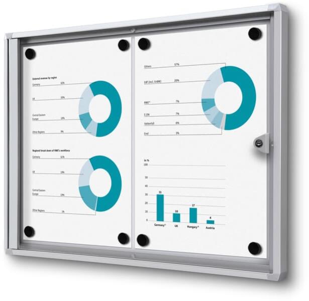 Belső információs kirakat Economy 2 x A4 - fém hátlap, tűzállóFőbb jellemzőkMéretek: 49,1 cm hosszú, 35 cm magas, 2,6 cm mélyKeret anyaga: alumíniumFelület: mágneses és írhatóAjtótípus: szárnyas ajtó plexiüveggelZár: hengeres zárMegfelelő formátum: 2 x A4Használat: belső térre, tűzállóGarancia: 5 évEz a Belső információs kirakat Economy ideális megoldás cégeknek, oktatási intézményeknek vagy hivataloknak, akik szeretnék biztonságosan és átláthatóan bemutatni a fontos híreket, információkat vagy dokumentumokat. A kiváló minőségű alumínium keret stabil és tartós keretet biztosít, míg a plexiüveg ajtó védelmet nyújt a tartalomnak, miközben a mágneses és írható hátlap sokoldalúságot kínál. A tűzálló kialakítás növeli a biztonságot, és a szárnyas ajtó hengeres zárral ellátva gondoskodik arról, hogy a tartalom illetéktelen kezekbe ne kerüljön. A 2 x A4-es méret lehetővé teszi, hogy több dokumentumot is rendezett formában helyezzen el egyszerre. Praktikus és biztonságos megoldás belső használatraHa egy megbízható és könnyen kezelhető információs táblát keres, amely kiválóan alkalmazható belső terekben, ez a kirakat remek választás. Ne habozzon, tegye átláthatóvá és rendezetté kommunikációját ezzel a minőségi termékkel!