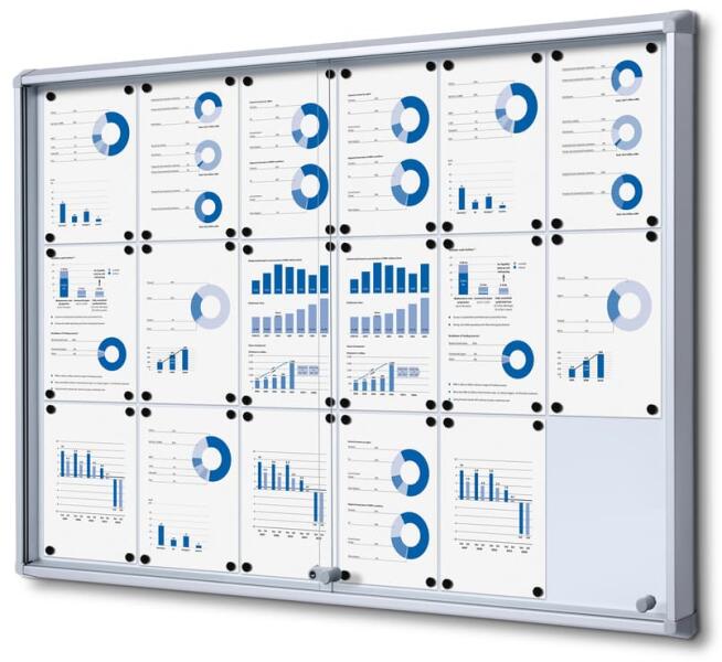 A tolóajtós belső vitrin kiváló megoldás információk bemutatására vagy fontos nyomtatott anyagok jól látható helyen történő megjelenítésére. A vitrin kiválóan alkalmas irodákba, folyosókra és előszobákba. A vitrin különösen alkalmas belső terekbe, ahol könnyű súlya miatt kényelmesen akasztható a falra . Ennek köszönhetően gyakorlatilag nem foglal helyet a térben. A 18 x A4 formátumú vitrin mágneses felülettel rendelkezik, amelyre írni lehet. Úgy tervezték, hogy szárazon törölhető jelölőkkel. Az írás mellett azonban mágnesekkel is csatolhat minden fontos dokumentumot, így mindig legyen szem előtt. A behelyezett tartalom biztonsága miatt nem kell aggódni, hiszen egy praktikus biztonsági üvegből készült tolóajtó és egy beépített zár, amely nemcsak a visszaélést, hanem a sérülést is megakadályozza. Sok méretben kínálunk tolóajtós belső vitrint. A falra rögzítéshez szükséges összes rögzítőanyagota csomag már tartalmazza. A tolóajtós belső vitrin fő előnyei A vitrin kiváló elem a belső terekben való megjelenítéshez Gyakorlatilag nem foglal helyet a térben Mágneses írható felülettel rendelkezik A vitrin praktikus tolóajtókkal van felszerelve A tartalom biztonságáról biztonsági üveg és beépített zár gondoskodikh2>Elegáns kialakítás Az ultravékony keret kiváló minőségű alumíniumból készült, amely nagyon tartós és megbízható, így védi a megjelenített tartalmat. A keret kiegészítve műanyag biztonsági sarkokkal.