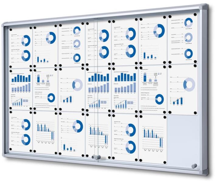 A tolóajtós belső vitrin kiváló megoldás információk bemutatására vagy fontos nyomtatott anyagok jól látható helyen történő megjelenítésére. A vitrin kiválóan alkalmas irodákba, folyosókra és előszobákba. A vitrin különösen alkalmas belső terekbe, ahol könnyű súlya miatt kényelmesen akasztható a falra . Ennek köszönhetően gyakorlatilag nem foglal helyet a térben. A 21 x A4 formátumú vitrin mágneses felülettel rendelkezik, amelyre írni lehet. Úgy tervezték, hogy szárazon törölhető jelölőkkel. Az írás mellett azonban mágnesekkel is csatolhat minden fontos dokumentumot, így mindig legyen szem előtt. A behelyezett tartalom biztonsága miatt nem kell aggódni, hiszen egy praktikus biztonsági üvegből készült tolóajtó és egy beépített zár, amely nemcsak a visszaélést, hanem a sérülést is megakadályozza. Sok méretben kínálunk tolóajtós belső vitrint. A falra rögzítéshez szükséges összes rögzítőanyagota csomag már tartalmazza. A tolóajtós belső vitrin fő előnyei A vitrin kiváló elem a belső terekben való megjelenítéshez Gyakorlatilag nem foglal helyet a térben Mágneses írható felülettel rendelkezik A vitrin praktikus tolóajtókkal van felszerelve A tartalom biztonságáról biztonsági üveg és beépített zár gondoskodikh2>Elegáns kialakítás Az ultravékony keret kiváló minőségű alumíniumból készült, amely nagyon tartós és megbízható, így védi a megjelenített tartalmat. A keret kiegészítve műanyag biztonsági sarkokkal.