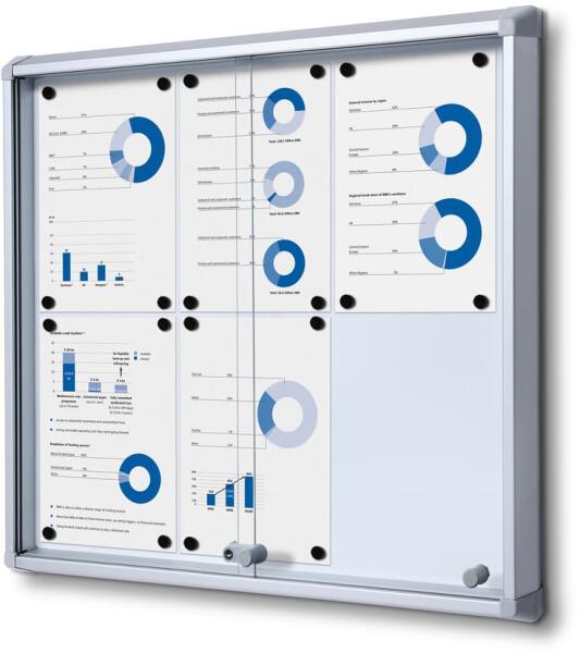 A tolóajtós belső vitrin kiváló megoldás információk bemutatására vagy fontos nyomtatott anyagok jól látható helyen történő megjelenítésére. A vitrin kiválóan alkalmas irodákba, folyosókra és előszobákba. A vitrin különösen alkalmas belső terekbe, ahol könnyű súlya miatt kényelmesen akasztható a falra . Ennek köszönhetően gyakorlatilag nem foglal helyet a térben. A 6 x A4 formátumú vitrin mágneses felülettel rendelkezik, amelyre írni lehet. Úgy tervezték, hogy szárazon törölhető jelölőkkel. Az írás mellett azonban mágnesekkel is csatolhat minden fontos dokumentumot, így mindig legyen szem előtt. A behelyezett tartalom biztonsága miatt nem kell aggódni, hiszen egy praktikus biztonsági üvegből készült tolóajtó és egy beépített zár, amely nemcsak a visszaélést, hanem a sérülést is megakadályozza. Sok méretben kínálunk tolóajtós belső vitrint. A falra rögzítéshez szükséges összes rögzítőanyagota csomag már tartalmazza. A tolóajtós belső vitrin fő előnyei A vitrin kiváló elem a belső terekben való megjelenítéshez Gyakorlatilag nem foglal helyet a térben Mágneses írható felülettel rendelkezik A vitrin praktikus tolóajtókkal van felszerelve A tartalom biztonságáról biztonsági üveg és beépített zár gondoskodikh2>Elegáns kialakítás Az ultravékony keret kiváló minőségű alumíniumból készült, amely nagyon tartós és megbízható, így védi a megjelenített tartalmat. A keret kiegészítve műanyag biztonsági sarkokkal.