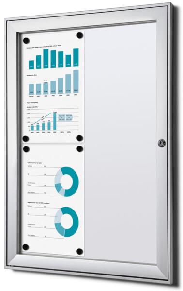 Belső zárható információs vitrin 4 x A4, tűzállóFő jellemzőkMéret: 69,6 cm (magasság) x 52,1 cm (hossz) x 2,3 cm (mélység)Keret anyaga: alumíniumÜveg típusa: plexiüvegFelület: mágneses és írhatóAjtótípus: szárnyas ajtóZár: hengeres, zárhatóMegfelelő formátum: 4 x A4 dokumentum tárolásaRendeltetés: belső használatraGarancia: 5 évA Belső zárható információs vitrin ideális megoldás irodák, üzletek vagy közintézmények számára, ahol fontos az információk biztonságos és átlátható elhelyezése. Alumínium kerete tartós, ugyanakkor modern megjelenést biztosít, míg a plexiüveg ajtó megvédi a kihelyezett dokumentumokat a sérülésektől és illetéktelen hozzáféréstől. A mágneses, írható felület lehetővé teszi az egyszerű és gyors információk megosztását és frissítését, akár napi szinten is. Négy darab A4-es méretű dokumentum elhelyezésére alkalmas, így tökéletesen átlátható és rendezett megjelenést nyújt. Biztonság és praktikumAz erős, zárható, hengeres ajtó biztosítja, hogy az információk mindig el legyenek zárva és biztonságban, megakadályozva az illetéktelen hozzáférést. A termék belső használatra készült, így beltéren helyezhető el. A 5 éves garancia pedig további biztonságot nyújt a hosszú távú használathoz. Válassza ezt a tűzálló és praktikus információs vitrint, ha megbízható, tartós és sokoldalú megoldást keres az információk rendezett tárolására! Ne habozzon, tegye átláthatóbbá és biztonságosabbá munkakörnyezetét még ma!