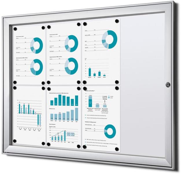 Belső zárható információs vitrin 8 x A4, tűzállóFőbb jellemzőkMéretek: 96,1 cm hosszú, 69,6 cm magas, 2,3 cm mélyAnyaga: alumínium keret, plexiüvegAjtótípus: szárnyas ajtó hengeres zárralFelület: mágneses és írhatóMegfelelő formátum: 8 x A4 lapok elhelyezéseHasználat: belső térre, tűzálló kialakításGarancia: 5 évEz a Belső zárható információs vitrin ideális megoldás hivatalos, irodai, vagy akár közintézményi környezetben történő információközlésre. Az alumínium keret biztos tartást és hosszú élettartamot garantál, miközben a plexiüveg védi a benne elhelyezett dokumentumokat a sérülésektől és a külső behatásoktól. A mágneses és írható felület multifunkcionális használatot tesz lehetővé, így nemcsak az információk rögzítésére, hanem azok folyamatos frissítésére is alkalmas. A szárnyas ajtó hengeres zárral biztosítja az információk védelmét jogosulatlan hozzáféréstől. Praktikus és biztonságos megoldásAz 8 x A4-es dokumentumoknak kialakított rekeszek jól áttekinthető tárolást kínálnak, így minden fontos információ könnyen hozzáférhető és rendezett marad. A vitrin tűzálló jellegének köszönhetően extra biztonságot nyújt, megfelelve a modern belső terek követelményeinek. Válassza ezt a strapabíró és esztétikus információs vitrint, hogy üzenetei mindig jól láthatóak és védve legyenek! Ismerje meg és rendeljen még ma!