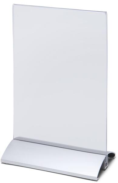A5-ös formátumú alumínium alapra épített, álló tájolású menüállvány kiváló megoldás reklám szórólapok vagy egyéb nyomtatott anyagok bemutatására, nem csak irodai környezetben. Ez a modern szerszám kiváló minőségű akrilból készült, amely megakadályozza a fakulást és a tartalom sérülését, emellett ezüst alumínium talppal rendelkezik, amely nemcsak kiváló stabilitást, de elegáns megjelenést is biztosít. Az állványt úgy tervezték, hogy jól látható helyen kerüljön elhelyezésre, ahol a kidolgozásának köszönhetően könnyen a figyelem középpontjába kerül. Alumínium alapon álló állványmenü fő előnyei, A5 portré formátum Az A5-ös állvány kiváló választás nyomtatott anyagok bemutatására A szerkezet kiváló minőségű akrilból készült alumínium talp A feldolgozásnak köszönhetően a figyelem középpontjába kerül Nagyon egyszerű és kényelmes szórólap felszerelés