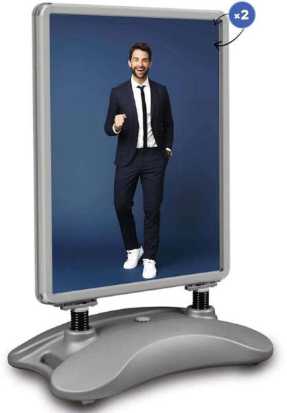 Kültéri információs tábla: B1-es méret, duplaoldalas, időjárásálló Ez a kültéri információs tábla ideális megoldás reklámanyagok, hirdetések vagy információk megjelenítésére kültéri környezetben. A robusztus kialakításnak és az intelligens funkcióknak köszönhetően tökéletes választás üzletek, rendezvények vagy közterületek számára. Kiemelt jellemzők:Duplaoldalas: Két oldalra is elhelyezhetőek a reklámanyagok, így maximális láthatóságot biztosítva. B1 méret: (707x1000 mm) Ideális méret a legtöbb reklámanyaghoz. UV-álló anyag: A szürke színű, UV-álló anyag védi a nyomtatást a nap káros hatásaitól, így a színek sokáig élénkek maradnak. Erős alumínium keret: Tartós és időjárásálló alumínium profilból készült keret biztosítja a tábla stabilitását. Vízzel tölthető talp: A vízzel tölthető talp biztosítja a tábla stabilitását, még szeles időben is. Rugós rögzítés: A rugós rögzítésnek köszönhetően a tábla alkalmazkodik a szélhez, megakadályozva a károsodást. Könnyű mozgathatóság: A fogantyú és az alján elhelyezett kerekek megkönnyítik a tábla mozgatását. Snap keret: A snap keret lehetővé teszi a plakátok gyors és egyszerű cseréjét. 18 kg (víz nélkül): Stabil és masszív kivitel. A tábla tökéletes választás, ha: Hatékonyan szeretnéd megjeleníteni reklámanyagaidat kültéren. Strapabíró és időjárásálló táblát keresel. Könnyen kezelhető és karbantartható megoldást szeretnél. Ne habozz, szerezd be most ezt a kiváló minőségű kültéri információs táblát!