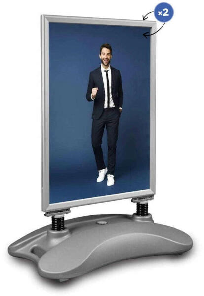 Két Oldalas Kültéri Információs Tábla - B2 Méret - Reklámozáshoz Tökéletes! ? Ez a kültéri információs tábla ideális megoldás reklámanyagok, hirdetések és információk megjelenítésére. Strapabíró kialakításának köszönhetően bármilyen időjárási körülmény között tökéletesen funkcionál. Főbb jellemzők:B2 méret (500x707 mm): Ideális méret a hatékony megjelenítéshez. Két oldalas: Kétszer annyi információt jeleníthet meg. UV-álló anyag: A színek sokáig élénkek maradnak, nem fakulnak ki a napon. Erős alumínium keret: Strapabíró és időtálló. Vízzel tölthető talp: Stabil, szélálló, nem borul fel könnyen. A kerekeknek köszönhetően könnyen mozgatható. Snap keret: A plakátok gyors és egyszerű cseréje. Rugós rögzítés: A tábla alkalmazkodik a szélhez. Miért válaszd ezt a táblát?Könnyű kezelhetőség: A snap keretnek köszönhetően pillanatok alatt kicserélheted a plakátokat. Időtálló minőség: Az erős alumínium keret és az UV-álló anyag garantálja a hosszú élettartamot. Stabilitás: A vízzel tölthető talp biztosítja a tábla stabilitását még szeles időben is. Praktikus: A kerekeknek köszönhetően könnyen mozgatható helyről helyre. Tökéletes választás: Üzletek számára Rendezvényekre Hirdetésekhez Információk megjelenítésére