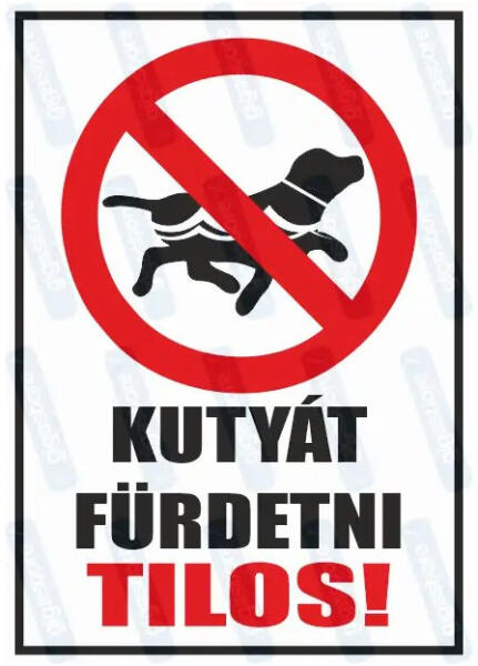 Kutyát fürdetni tilos " felirat, és tiltó piktogram, öntapadós vinyl matrica, vagy PVC tábla. -UV és időjárás álló-Több méretben választhatóA tiltó fehér alapon áthúzott piros kör és fekete piktogram jelzések a biztonságot és az egészséget veszélyeztető magatartást tiltanak, valamint figyelmeztetnek a veszélyforrásra.