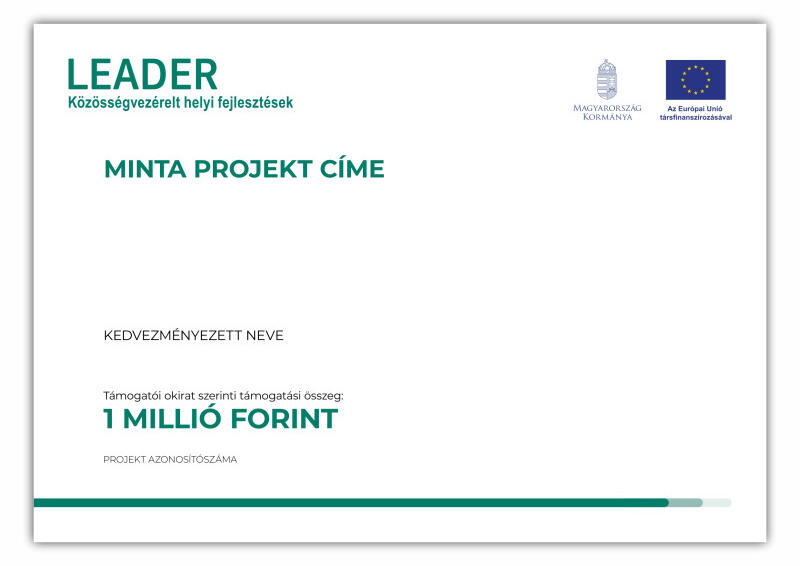 LEADER program információs tábla – A3, PVC, időjárásálló A LEADER közösségvezérelt helyi fejlesztések programhoz kötelező információs tábla. A3-as méretben, 5 mm vastag PVC-ből készül, időjárásálló vinyl bevonattal. Kültéri használatra tartós és UV-álló kivitel.