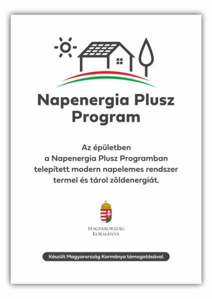 Napenergia Plusz Program információs tábla – A4 álló, PVC, időjárásálló Az előírásoknak megfelelő információs tábla a Napenergia Plusz Programhoz. A4-es méretben, álló formátumban, 3 mm vastag PVC-ből készül, időjárásálló kivitelben, így kültéri és beltéri használatra egyaránt alkalmas. Tartós, UV-álló nyomattal, hosszú élettartammal.