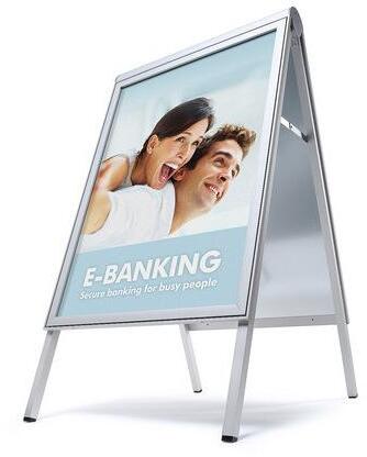 A kétoldalas A alakú állványok éles sarkokkal és 37 mm profillal alkalmasak szórólapok, fényképek, plakátok, speciális ajánlatok stb. bemutatására. A reklámtáblák alumíniumból készülnek, rozsdaálló hátoldallal és UV szűrős fóliával vannak ellátva, melyek tartóssá teszik őket és megakadályozzák a plakátok kifakulását. Az állványok ütésállók, kiváló stabilitással rendelkeznek a levágott műanyag lábvégződéseknek köszönhetően. A könnyű alumínium keret lehetővé teszi a könnyű kezelést és kiváló tartósságot.