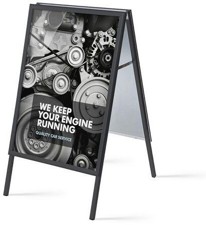 Kétoldalas A alakú állványok éles sarkokkal és alumínium plakáttartóval a motívum könnyű cseréjéért. A behajtható keretek 30 mm profilból készülnek. Az állványok az alumínium lábaknak és a levágott műanyag végződéseknek köszönhetően nagyon stabilak. Az UV szűrős védőfóliás táblák tartósabbá teszik a plakátot és megakadályozzák annak kifakulását.