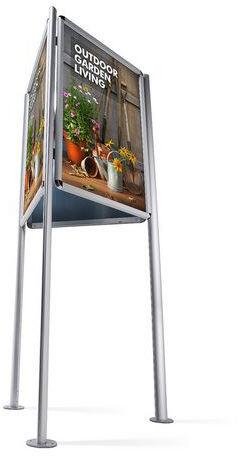 Három oldalú reklámállványok plakáttartóval 32 mm keretprofillal. Az állványok az alumínium lábaknak köszönhetően nagyon stabilak. A reklámtáblák ellenállnak az időjárás viszontagságainak és a rozsdásodásnak.
