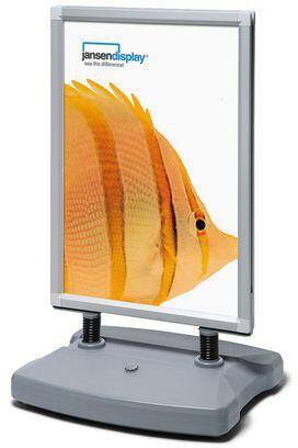 A kétoldalas reklámtáblák alkalmasak kültéri prezentációkhoz. A görgős műanyag alapzatok megtölthetők vízzel vagy homokkal. A reklámpanelek kiváló minőségű acél merevített rugókkal és ütésálló középső panelekkel rendelkeznek. Az állványok műanyag biztonsági sarkokkal rendelkeznek.