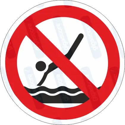Vízbe ugrást tiltó piktogram, öntapadós vinyl matrica. -UV és időjárás álló-Több méretben választhatóA tiltó fehér alapon áthúzott piros kör és fekete piktogram jelzések a biztonságot és az egészséget veszélyeztető magatartást tiltanak, valamint figyelmeztetnek a veszélyforrásra.